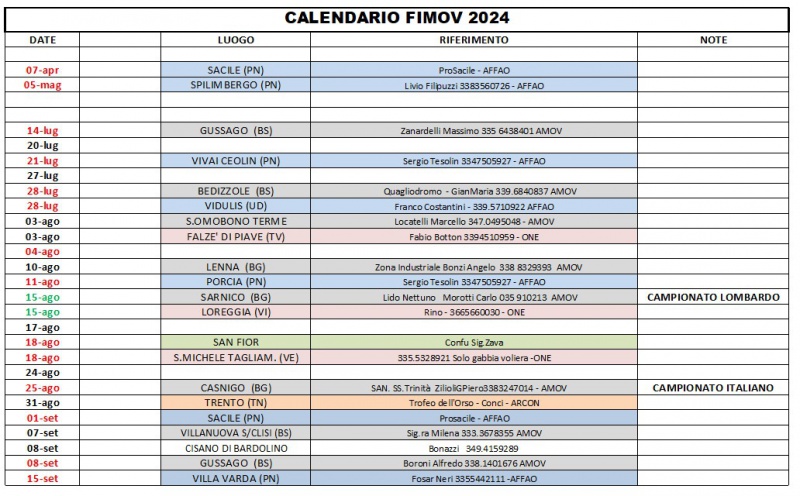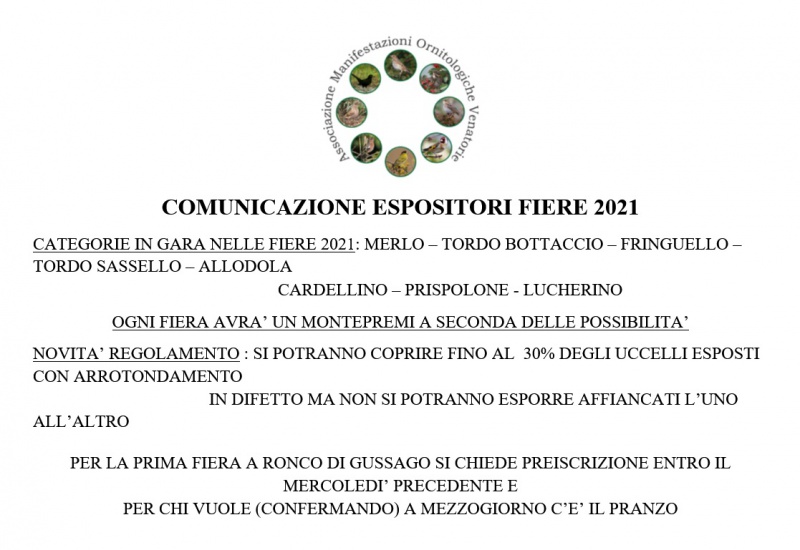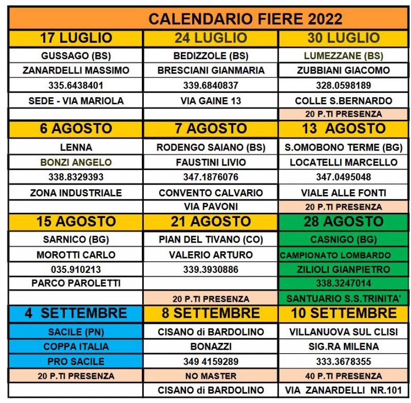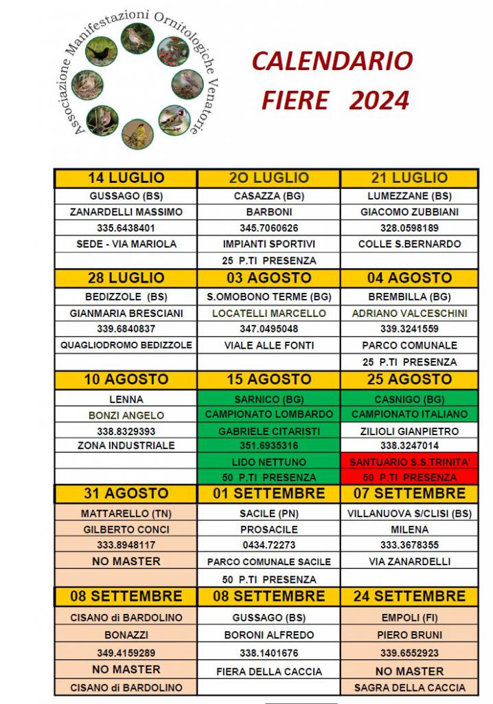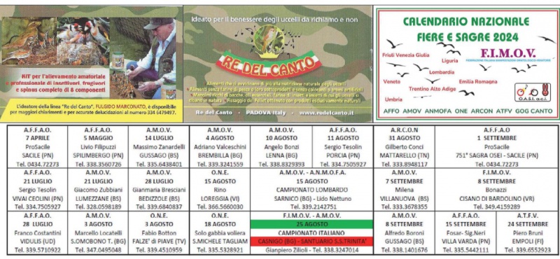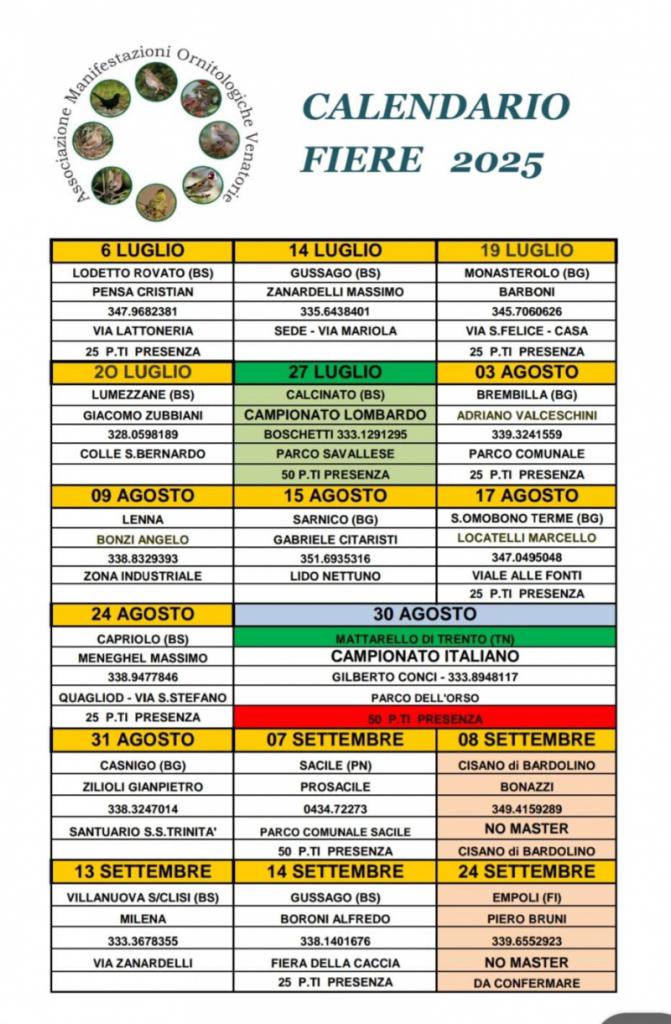 E’ pronto il calendario delle manifestazioni e della fiere; delle sagre e dei Campionati che per anni ci anno appassionato ed unito racchiusi dalla passione ornitofila che ci accumuna, senza differenza di età, sesso e lavoro.
