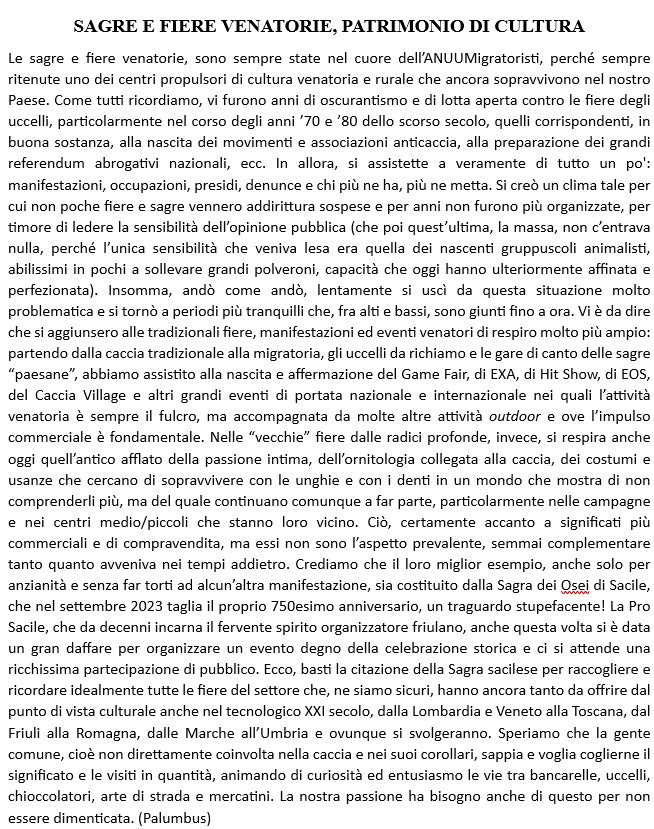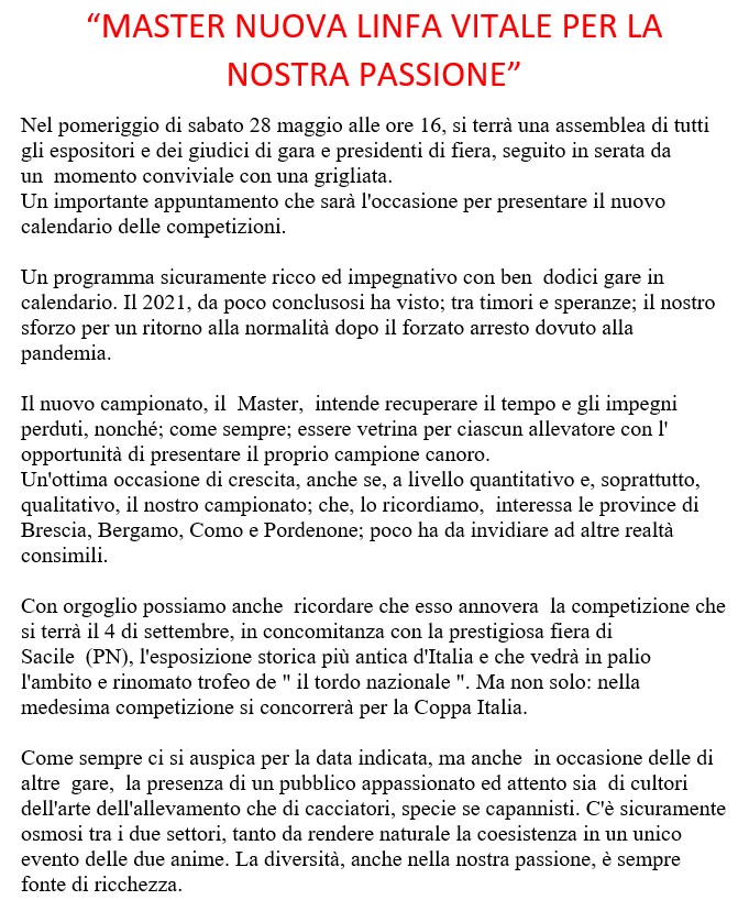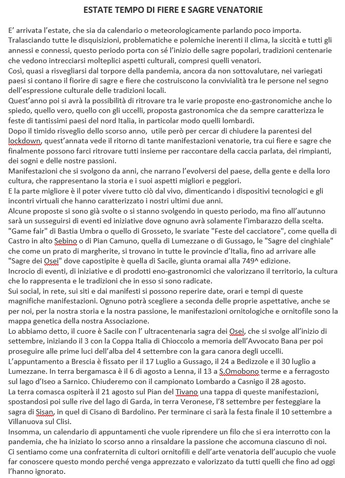Allora, tutti a Lodetto, domenica prossima 6 luglio. Vi aspettiamo, colleghi allevatori, cultori, cacciatori o semplici curiosi, siete i benvenuti.
